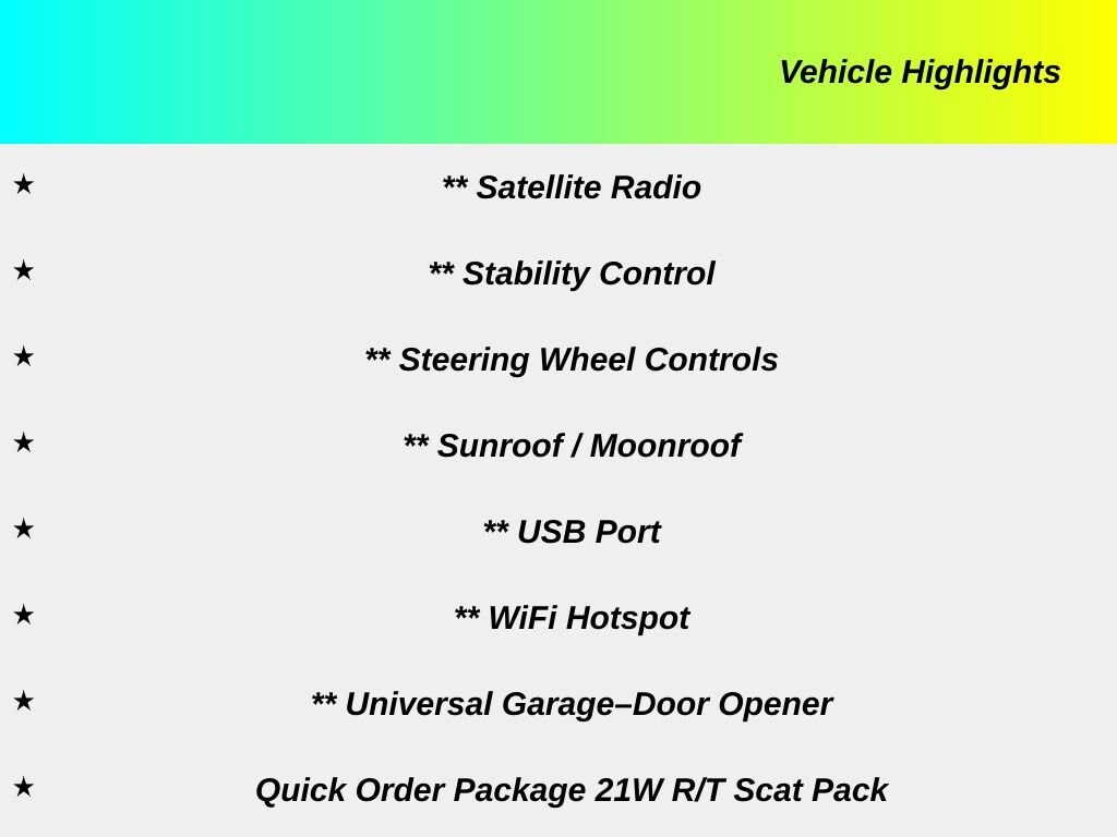 ** Aluminum Wheels, ** Apple CarPlay/Android Auto, ** Power Sunroof/Moonroof, ** Backup Camera, ** Blind Spot Monitor, ** Bluetooth, Hands Free, ** Brake Assist, ** Cross Traffic Alert, ** Cruise Control, ** HomeLink, ** Keyless Entry, ** Keyless Start, ** Power Driver Seat, ** Power Driver and Passenger Seats, ** Premium Sound System / Premium Audio, ** Remote Start, ** Satellite Radio, ** Stability Control, ** Steering Wheel Controls, ** Sunroof / Moonroof, ** USB Port, ** WiFi Hotspot, ** Universal Garage Door Opener, Charger R/T Scat Pack, 4D Sedan, SRT HEMI 6.4L V8 MDS, 8-Speed Automatic, RWD, Pitch Black Clearcoat, Black Cloth, 10 Beats Premium Speakers w/Subwoofer, 552 Watt Amplifier, Auto-Dimming Exterior Driver Mirror, Auto-dimming Rear-View mirror, Automatic temperature control, Beats Audio Group, Bi-Function HID Projector Head Lamps, Blind Spot Power Heated Mirror, Driver Confidence Group, Exterior Mirrors w/Heating Element, Front dual zone A/C, Front fog lights, Fully automatic headlights, Integrated Voice Command w/Bluetooth, Power Sunroof, Quick Order Package 21W R/T Scat Pack, Radio: Uconnect 4C w/8.4" Display, Rhombi 2-Pc Wheel Center Cap, Scat Pack Logo Cloth Seat, Wheels: 20" x 9.0" Forged/Painted Aluminum.