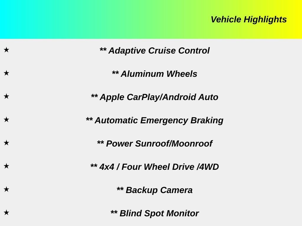 ** Adaptive Cruise Control, ** Aluminum Wheels, ** Apple CarPlay/Android Auto, ** Automatic Emergency Braking, ** Power Sunroof/Moonroof, ** 4x4 / Four Wheel Drive /4WD, ** Backup Camera, ** Blind Spot Monitor, ** Bluetooth, Hands Free, ** Brake Assist, ** Cooled Seats, ** Cross Traffic Alert, ** Head-Up Display, ** Heated Seats, ** Heated Steering Wheel, ** HomeLink, ** Keyless Entry, ** Keyless Start, ** LED Headlights, ** Lane Departure Warning, ** Navigation System, ** Panoramic Roof / Sunroof, ** Power Driver Seat, ** Power Driver and Passenger Seats, ** Power Sliding Rear Window, ** Premium Sound System / Premium Audio, ** Rain Sensing Wipers, ** Rear Cross Traffic Alert, ** Remote Start, ** Running Boards, ** Satellite Radio, ** Stability Control, ** Steering Wheel Controls, ** Sunroof / Moonroof, ** Dual Pane Panoramic Sunroof/ Moonroof, ** Tow Hitch / Trailer Hitch, ** USB Port, ** WiFi Hotspot, ** Universal Garage Door Opener, ** Heated Second Row Seats, F-150 Lariat, 4D SuperCrew, 5.0L V8, 10-Speed Automatic, 4WD, Gray Metallic, Black Premium Synthetic, 2nd Row Heated Seats, 4 Pickup Box Tie-Down Plates, 6" Extended Black Running Boards, ActiveX Trimmed Bucket Seats (B), Ambient Lighting - Ice Blue Color Only, Auto High-beam Headlights, Auto-dimming Rear-View mirror, Bed Utility Package, Black Exterior Badging, Black Grille, Black Taillamp Bezels, Body-Color Front & Rear Bumpers, Body-Color Skull Caps & Door Handles, Console Worksurface, Dark Interior Appliques, Electronic Locking w/3.31 Axle Ratio, Equipment Group 502A High, Front dual zone A/C, Fully automatic headlights, Gray Box Side Decal, GVWR: 7,100 lbs Payload Package, Heads-Up Display, Illuminated Driver & Passenger Visors, Lariat Black Appearance Package, LED Box Lighting, Matte Black Tailgate F-150 Decal, Mobile Office Package, Partitioned Lockable Rear Storage, Power Tailgate, Power-Sliding Rear Window, Pro Access Tailgate, Radio: B&O Unleashed Sound System by Bang & Olufsen, Rain sensing wipers, Turn signal indicator mirrors, Twin Panel Moonroof, Wheels: 20" Gloss Black Painted Aluminum, Wireless Charging.