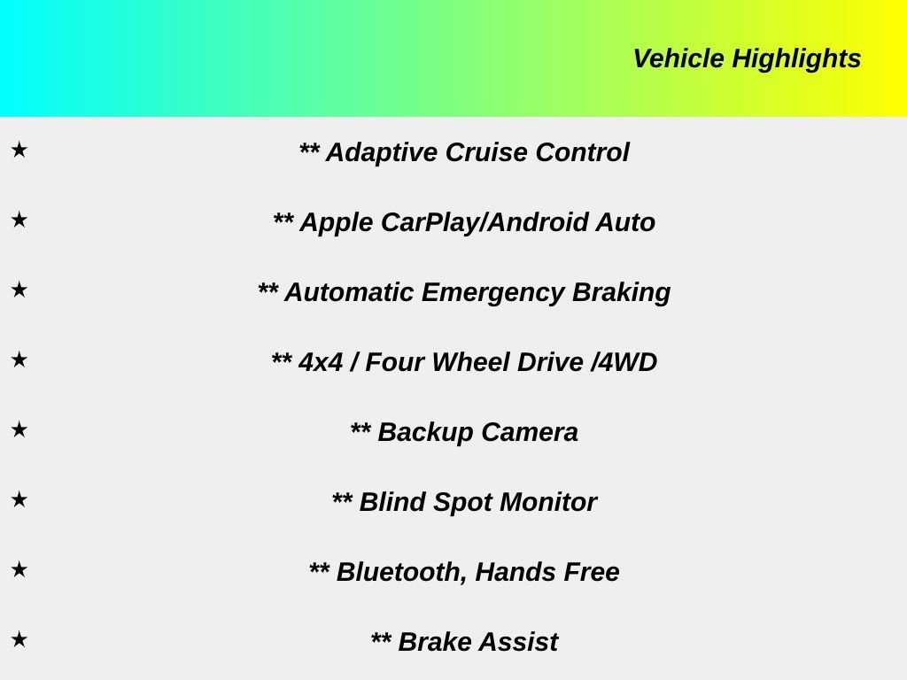 ** Adaptive Cruise Control, ** Apple CarPlay/Android Auto, ** Automatic Emergency Braking, ** 4x4 / Four Wheel Drive /4WD, ** Backup Camera, ** Blind Spot Monitor, ** Bluetooth, Hands Free, ** Brake Assist, ** Cross Traffic Alert, ** Keyless Entry, ** Keyless Start, ** LED Headlights, ** Lane Departure Warning, ** Rain Sensing Wipers, ** Roof Rack, ** Satellite Radio, ** Stability Control, ** Steering Wheel Controls, ** USB Port, ** Off Road Suspension, ** Selec-Terrain System, ** Hill Start Assist, Compass Trailhawk, 4D Sport Utility, 2.4L I4, 9-Speed 948TE Automatic, 4WD, Bright White Clearcoat, Ruby Red/Black Cloth, 10.1" Touchscreen Display, 4 Pin Wiring Harness, Auto-dimming Rear-View mirror, Automatic temperature control, Class III Receiver Hitch, Front dual zone A/C, Front fog lights, Fully automatic headlights, Heated door mirrors, Power door mirrors, Quick Order Package 2GE, Trailer Tow Group, Wheels: 17" x 6.5" Painted Diamond Cut Aluminum.