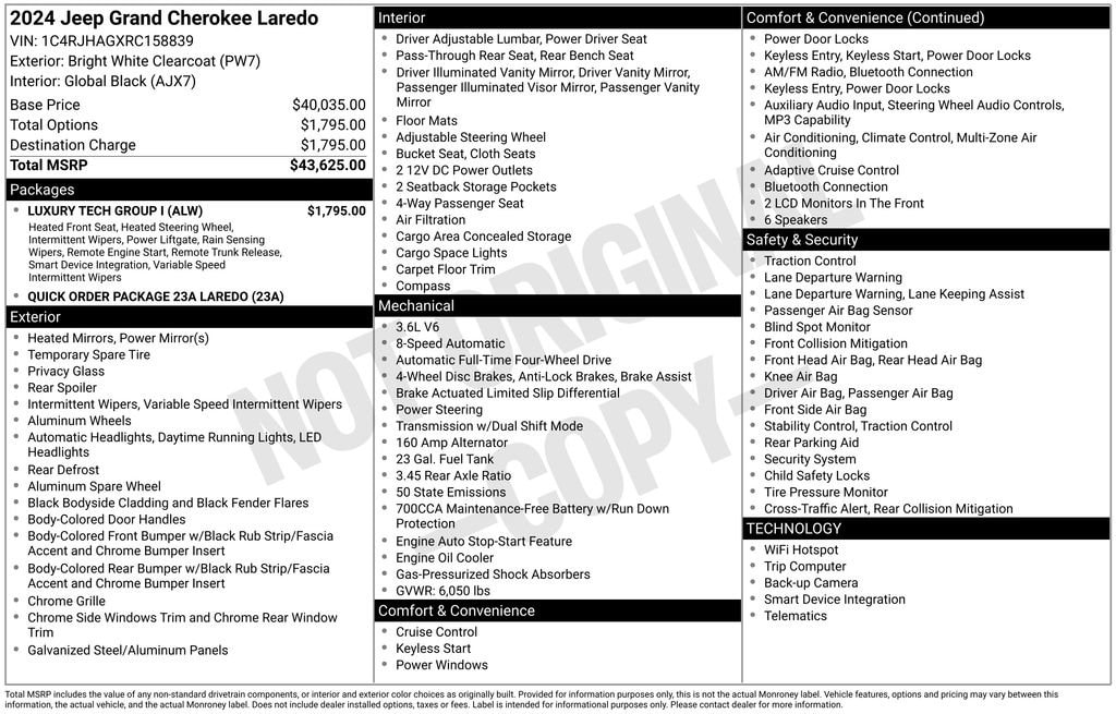 Bright White Clearcoat 2024 Jeep Grand Cherokee 4D Sport Utility Laredo 3.6L V6 24V VVT 19/26 City/Highway MPG 8-Speed Automatic 4WD