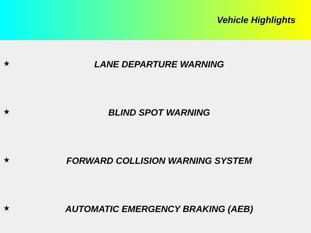 • Forward collision: Intelligent Forward Collision Warning w/Automatic Emergency Braking (AEB) mitigation