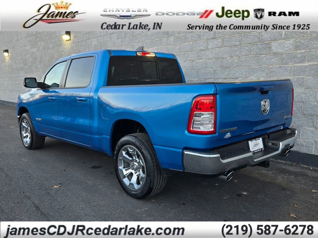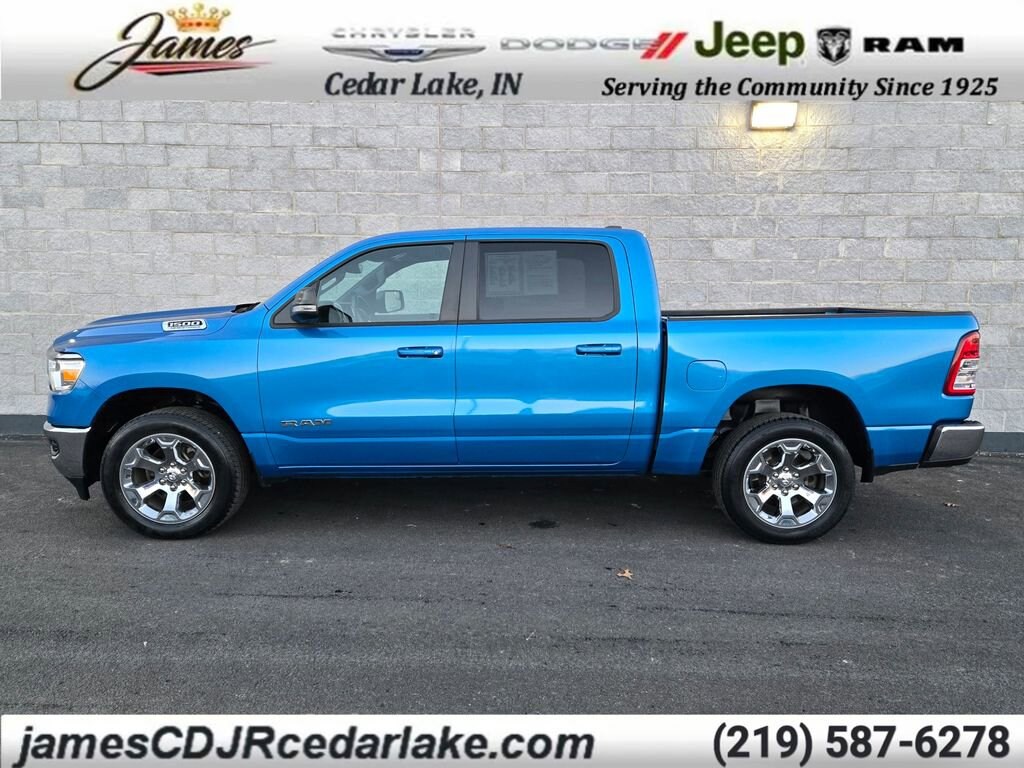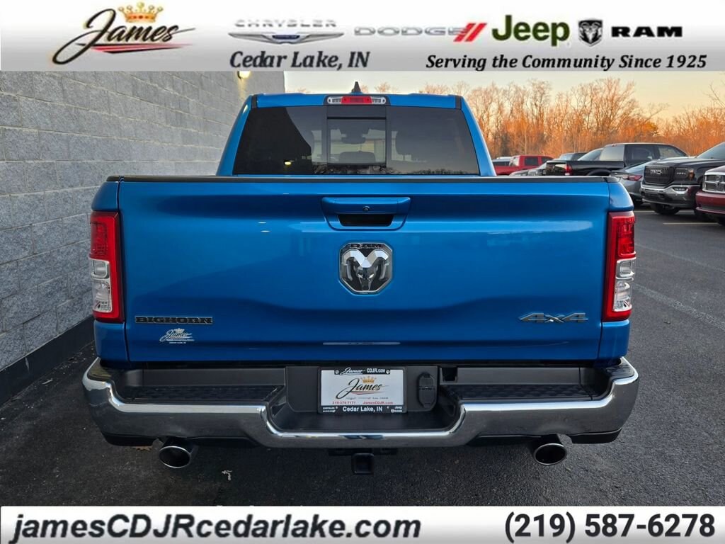 ** Alloy Wheels / Premium Wheels, ** Apple CarPlay/Android Auto, ** 4x4 / Four Wheel Drive /4WD, ** Backup Camera, ** Bluetooth, Hands Free, ** HomeLink, ** Keyless Entry, ** Navigation System, ** Power Driver Seat, ** Power Sliding Rear Window, ** Remote Start, ** Satellite Radio, ** Steering Wheel Controls, ** Tow Hitch / Trailer Hitch, ** USB Port, ** WiFi Hotspot, ** Universal Garage Door Opener, ** Low Miles, ** 20-Inch Aluminum Chrome Clad Wheels, ** Power Lumbar Adjustable Driver Seat, ** Power Adjustable Pedals, 1500 Big Horn/Lone Star, 4D Crew Cab, HEMI 5.7L V8 Multi Displacement VVT eTorque, 8-Speed Automatic, 4WD, Hydro Blue Pearlcoat, Black Cloth, 2nd Row In Floor Storage Bins, 4G LTE Wi-Fi Hot Spot, 8.4" Touchscreen Display, AM/FM radio, Apple CarPlay, Auto-Dimming Exterior Driver Mirror, Auto-Dimming Rear-View Mirror, Big Horn Badge, Big Horn Level 1 Equipment Group, Black Exterior Mirrors, Black Premium Power Mirrors, Bluetooth Handsfree Phone & Audio, Class IV Receiver Hitch, Cluster 3.5" TFT Color Display, Connectivity - US/Canada, Convex Wide-Angle Mirror Insert, Delay-off headlights, Emergency communication system: SiriusXM Guardian, Exterior Mirrors Courtesy Lamps, Exterior Mirrors w/Heating Element, Exterior Mirrors w/Supplemental Signals, For Details, Visit DriveUconnect.com, Front Center Armrest w/Storage, Front fog lights, Front Seat Back Map Pockets, Fully automatic headlights, Global Telematics Box Module (TBM), Glove Box Lamp, Google Android Auto, GPS Antenna Input, Heated door mirrors, Heavy-Duty Engine Cooling, Integrated Center Stack Radio, Navigation System, Panic alarm, Power 2-Way Driver Lumbar Adjust, Power 8-Way Driver Seat, Power Adjustable Pedals, Power-Folding Mirrors, Quick Order Package 27Z Big Horn, Radio: Uconnect 3 w/5" Display, Radio: Uconnect 5 W w/8.4" Display, Rear Dome w/On/Off Switch Lamp, Rear Power Sliding Window, Rear Window Defroster, Remote Start System, SiriusXM Radio Service, SiriusXM Satellite Radio, Sun Visors w/Illuminated Vanity Mirrors, Universal Garage Door Opener, USB Host Flip, Variably intermittent wipers, Wheels: 20" x 9" Aluminum Chrome Clad (WRK).