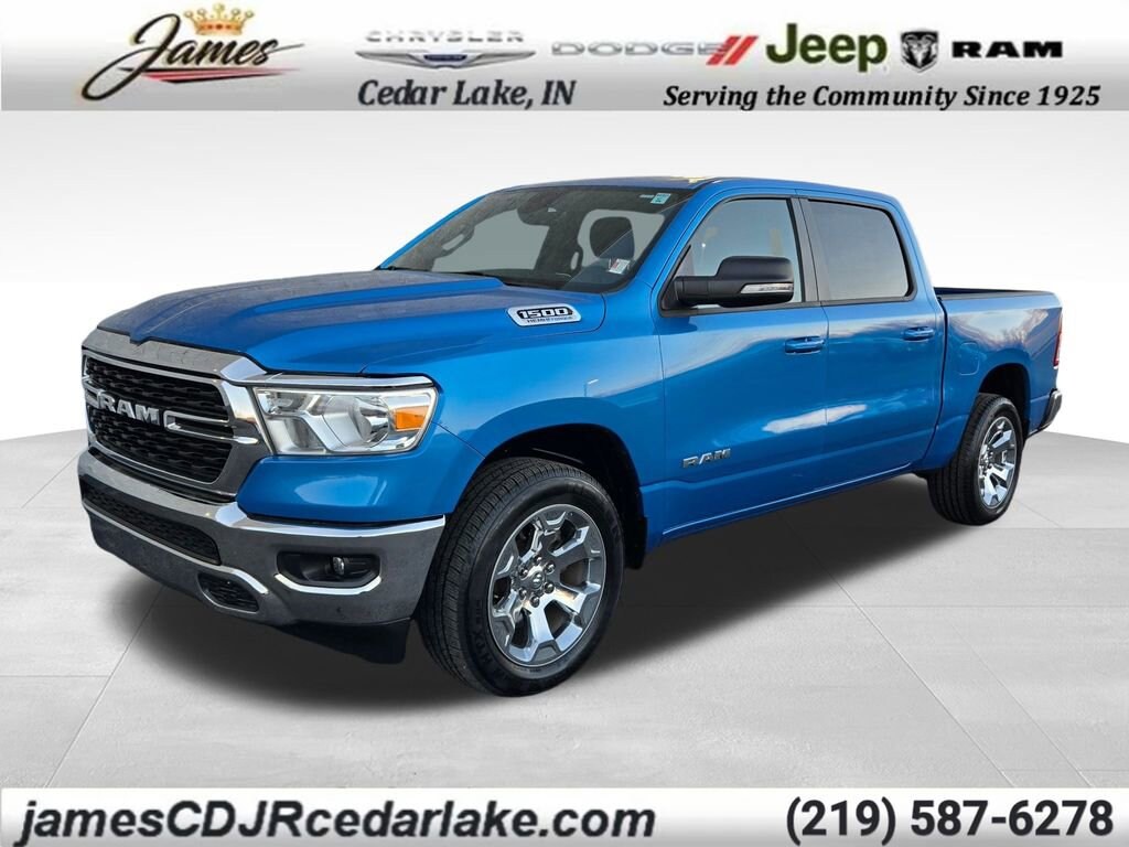 Hydro Blue Pearlcoat 2022 Ram 1500 4D Crew Cab Big Horn/Lone Star HEMI 5.7L V8 Multi Displacement VVT eTorque 15/21 City/Highway MPG 8-Speed Automatic 4WD
